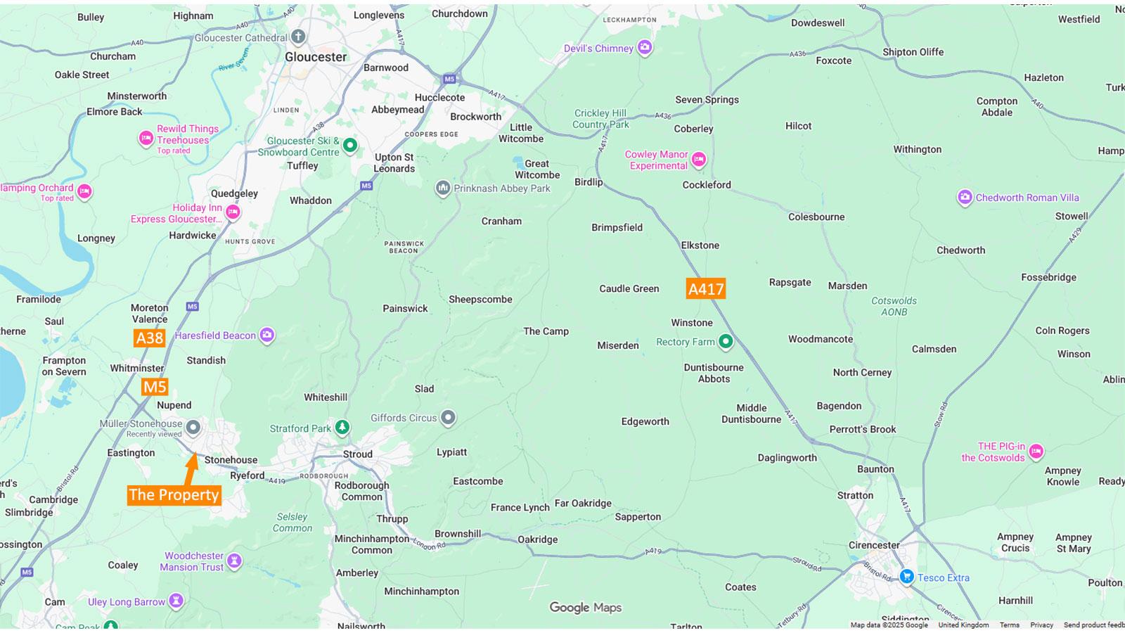 3 miles west of Stroud, 8 miles south of Gloucester, 14 miles west of Cirencester, 24 miles north east of Bristol