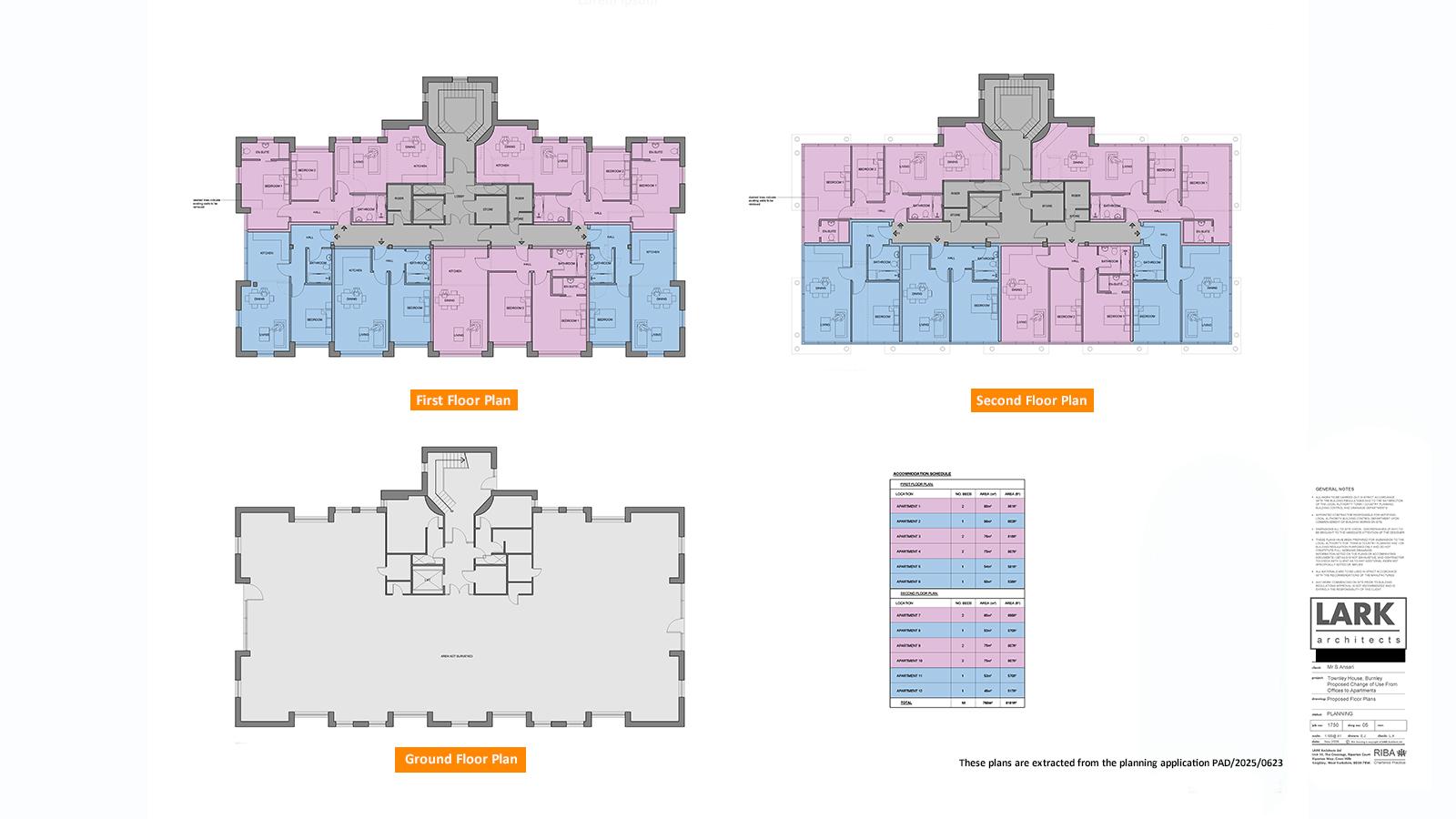 Planning permission has been granted on 26th January 2026 by Burnley Borough Council under reference No. PAD/2025/0623 for the 1st and 2nd floors from offices to form 12 apartments (c3).