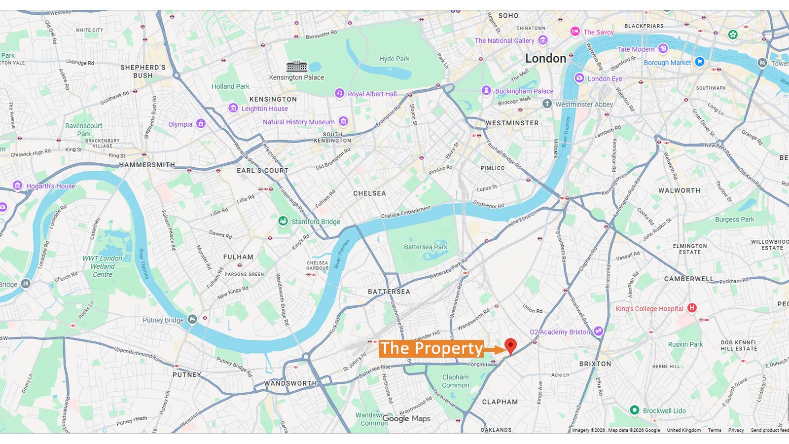 5 miles south-west of the West End, 500 metres east of Clapham Common, 2 miles south-west of the Oval Cricket Ground, 3 miles south of Victoria